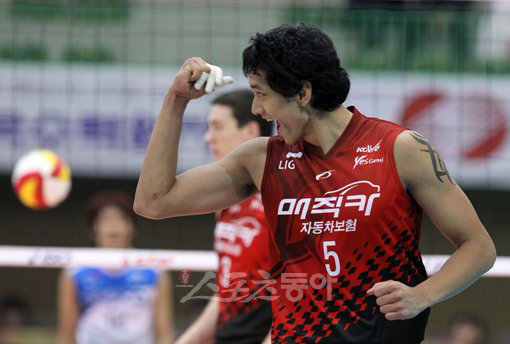 19일 오후 수원실내체육관에서 열린 남자 프로배구 V리그 KEPCO45와 LIG손해보험의 경기에서 LIG손해보험의 김요한이 공격에 성공한 후 환호하고 있다.