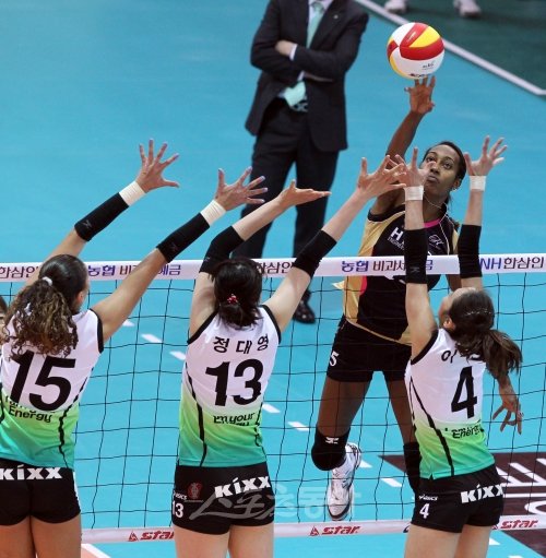 19일 오후 수원실내체육관에서 열린 여자 프로배구 V리그 현대건설과 GS칼텍스의 경기에서 현대건설의 케니가 GS칼텍스의 제시카, 정대영, 이숙자의 블로킹을 앞에 두고 공격을 하고 있다.