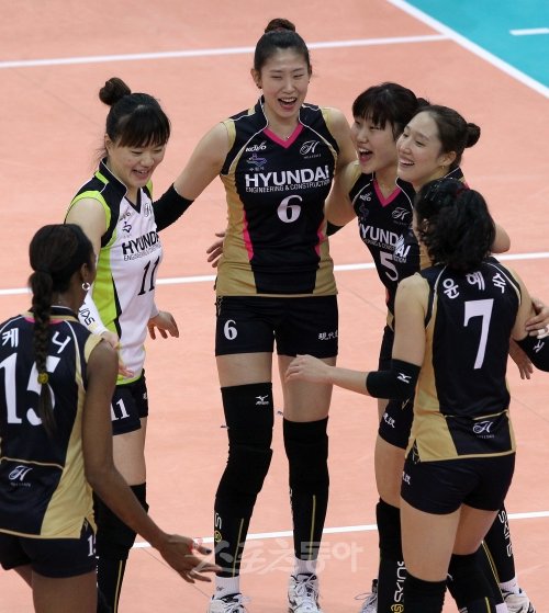 19일 오후 수원실내체육관에서 열린 여자 프로배구 V리그 현대건설과 GS칼텍스의 경기에서 승리한 현대건설의 선수들이 환호하고 있다.