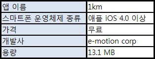 SND는 기존의 결혼정보회사와 달리 상대를 소개 받는 데 비용이 들지 않거나 비용이 있더라도 상대적으로 저렴해서 최근 들어 20~30대 ‘싱글’들 사이에서 인기를 누리고 있다. 이미 해외에서는 주스크(Zoosk), 오케이큐피드(OkCupid) 등의 SND들이 개발되었고, 국내에서도 SNS붐을 타고 관련 어플이 속속 등장하고 있다. 이번에 소개할 ‘1km’는 e-motion에서 제작한 위치 기반의 SND로, 현재 자신의 위치에서 특정 범위 안에 있는 연인을 찾아주는 아이폰용 어플이다. 후즈히어(Whoshere), 궁합 어플 등과 비슷하다고 할 수 있다.