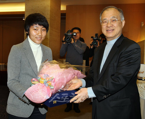 21일 오전 서울 서초구 팔레스호텔 그랜드볼룸에서 열린 제9회 홍명보장학재단 장학금 수여식에서 여민지가 강지원 변호사로부터 글로리로드상을 받은 후 밝게 웃고 있다.
