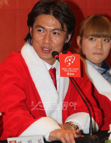 21일 오전 서울 서초구 팔레스호텔 그랜드볼룸에서 열린 'FOOTBALL MATCH 2010' 미디어데이에서 산타복장을 한 홍명보가 취재진의 질문에 답변을 하고 있다.