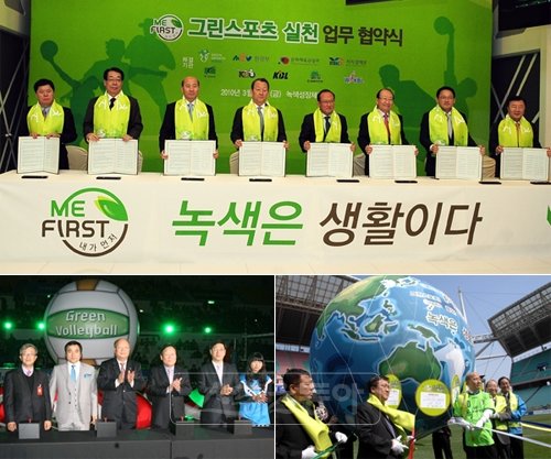 프로야구 SK에서 시작된 ‘그린스포츠’ 물결은 스포츠 전반으로 퍼져 나가고 있다. 정부 유관 단체와 프로 스포츠 5개 단체가 ‘그린스포츠 실천 업무 협약’을 맺은 데 이어 프로배구 현대캐피탈은 환경부와 손잡고 ‘그린발리볼’ 출범식(아래사진 왼쪽)을 열었다. 또 프로축구 전북현대도 ‘그린 함성 이벤트’(아래사진 오른쪽)를 열고 동참 서명 캠페인을 벌였다. 스포츠동아DB