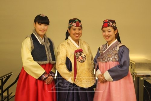 한국 여자씨름계의 간판스타들인 임수정, 송송화, 이연우(왼쪽부터)가 한복을 입고 스포츠동아 독자들에게 새해 인사를 하고 있다.