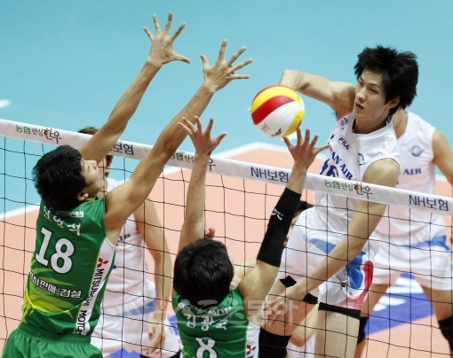 10-11 프로배구 대한항공 대 우리캐피탈 경기가 30일 인천도원시립체육관에서 열렸다. 대한항공 진상헌이 우리캐피탈 신영석과 김광국의 블로킹 사이로 스파이크를 날리고 있다. 스포츠동아DB