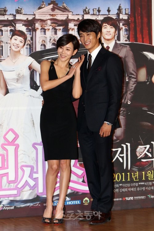 연기자 박예진(왼쪽)과 송승헌이 3일 서울 중구 소공동 롯데호텔 서울 3층 사파이어볼룸에서 열린 MBC 수목 미니시리즈 ‘마이 프린세스’의 제작발표회에서 포토타임을 갖다 사회자의 다정한 포즈 요구에 응하고 있다.