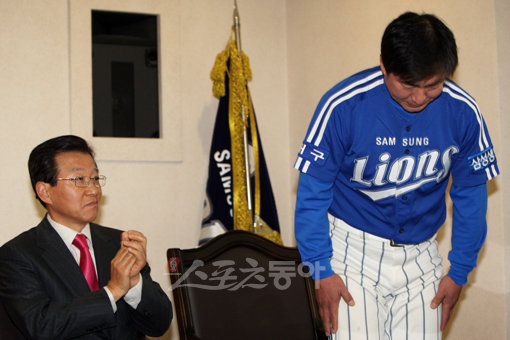 5일 경북 경산시 삼성라이온즈 경산볼파크에서 제13대 감독으로 취임한 류중일 신임 감독이 취임사에 앞서 인사를 하고 있다. 옆에서 박수를 치고 있는 김 인 사장(왼쪽).