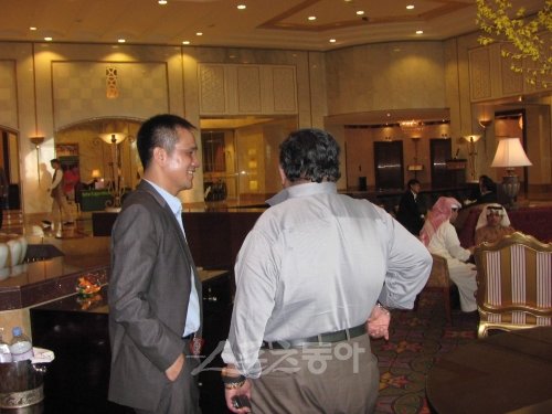 김주성 대한축구협회 국제국장(왼쪽)이 정몽준 FIFA 부회장 선거 캠프가 마련된 도하 리츠칼튼 호텔 커피숍에서 동남아시아 축구 관계자와 대화를 나누고 있다. 스포츠동아DB