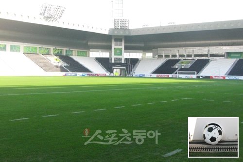카타르는 2022년 월드컵 개최 공약으로 내세운 에어컨 스타디움을 이미 운영 중이다. 에어컨 스타디움인 알 사드 경기장 전경. (작은 사진) 축구공 모양의 에어컨에서 바람이 나와 온도를 낮춘다. 도하(카타르) | 남장현 기자 yoshike3@donga.com