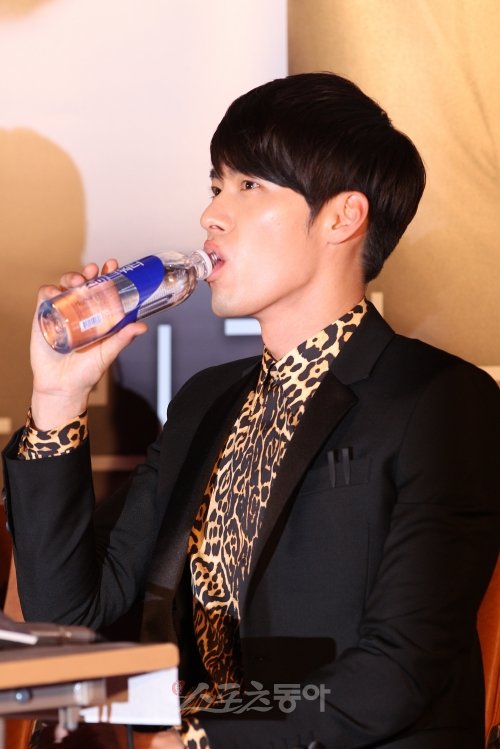 배우 현빈이 20일 오후 서울 중구 을지로 메가박스 동대문에서 열린 영화 ‘사랑한다, 사랑하지 않는다’의 제작보고회에 참석해 목이 탄 지 병째 물을 들이키고 있다.