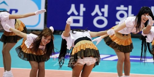 24일 오후 경기 수원시 실내체육관에서 열린 프로배구 V-리그 현대건설과 흥국생명의 경기에서 치어리더들이 흥을 돋우며 응원을 하고 있다.
