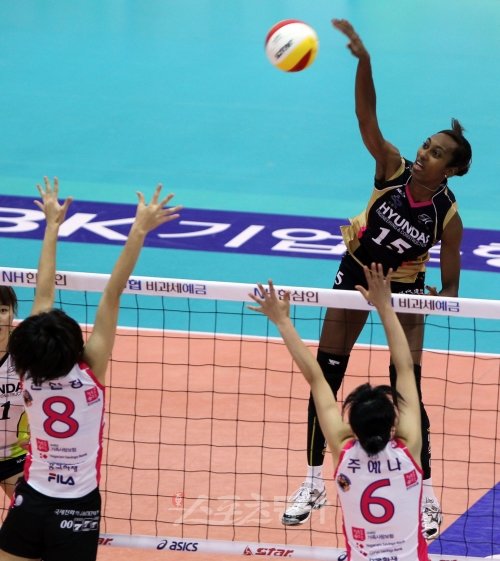 24일 오후 경기 수원시 실내체육관에서 열린 프로배구 V-리그 현대건설과 흥국생명의 경기에서 현대건설의 케니가 흥국생명의 전민정과 주예나의 블로킹을 피해 공격을 하고 있다.