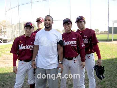 개리 셰필드(왼쪽에서 3번째)를 보자마자 장난기 가득한 강귀태(왼쪽에서 2번째)가 뛰어나와 반겼다. 정수성(왼쪽)과 송지만(왼쪽에서 4번째), 강정호(오른쪽) 등 넥센의 주요타자들이 셰필드와 다정한 포즈를 취했다.