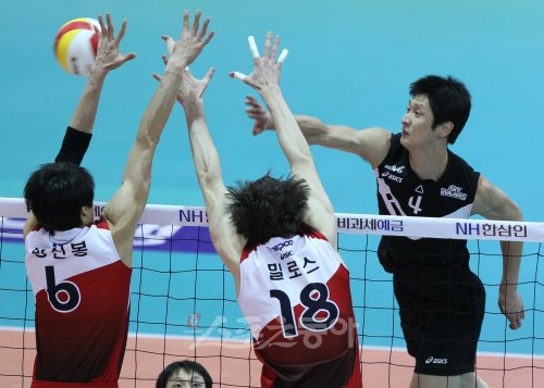 26일 저녁 경기 수원시 실내체육관에서 열린 프로배구 V-리그 KEPCO45와 현대캐피탈의 경기에서 현대캐피탈의 문성민이 KEPCO45의 방신봉과 밀로스의 블로킹 사이로 공격을 하고 있다.