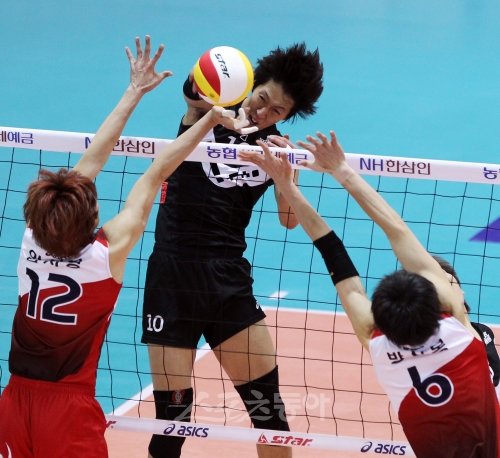 26일 저녁 경기 수원시 실내체육관에서 열린 프로배구 V-리그 KEPCO45와 현대캐피탈의 경기에서 현대캐피탈의 윤봉우가 KEPCO45의 임시형과 방신봉의 블로킹을 피해 공격하고 있다.