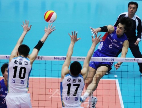 27일 저녁 경기 성남시 실내체육관에서 열린 프로배구 V-리그 상무신협과 대한항공의 경기에서 대한항공의 김학민이 상무의 활설민과 강민웅의 블로킹을 뚫고 공격하고 있다.