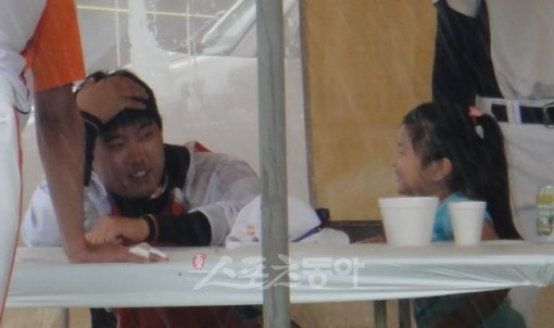 31일(한국시간) 하와이 센트럴 오이후 리저널파크에 갑작스러운 폭우가 쏟아졌다. 예보됐던 소나기였다. 선수들이 급히 간이식당 천막 아래로 뛰어들어 비를 피하는 와중에 에이스 류현진의 눈에 한 소녀가 들어왔다. 선수단 식사를 배달하는 아주머니의 어린 딸. 덩치 큰 오빠가 짓궂은 장난을 걸자 소녀는 대담하게도 대한민국 에이스의 머리를 한 대 때리며 응수했다.(위)