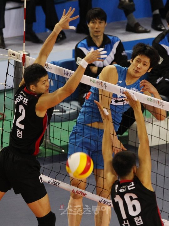 17일 오후 충남 천안 유관순체육관에서 열린 프로배구 V-리그 현대캐피탈과 상무신협의 경기에서 현대캐피탈 문성민이 상무신협 홍정표와 황성근의 블로킹을 피해 스파이크를 날리고 있다.