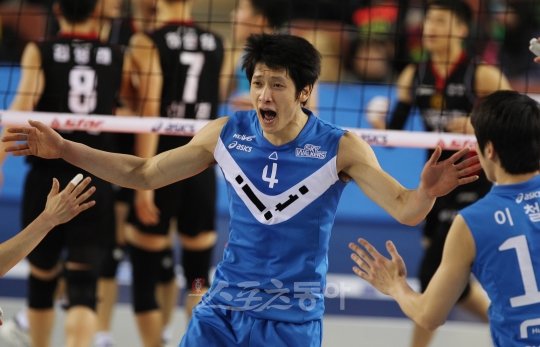 17일 오후 충남 천안 유관순체육관에서 열린 프로배구 V-리그 현대캐피탈과 상무신협의 경기에서 현대캐피탈 문성민이 공격에 성공한 후 환호하고 있다.