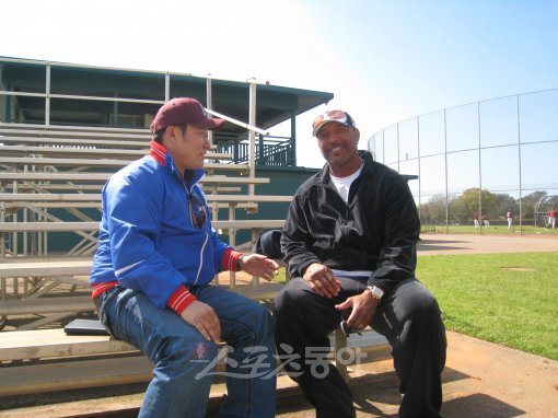 스포츠동아 전영희 기자(왼쪽)가 플로리다 세인트피터스버그 넥센 캠프에서 ‘박찬호 도우미’로 이름을 떨쳤던 개리 셰필드와 얘기를 나누고 있다.