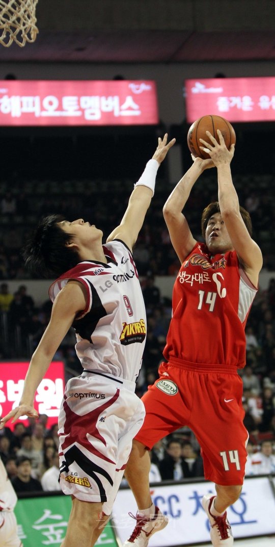 18일 서울 잠실학생체육관에서 열린 2010-11시즌 현대 모비스 프로농구 서울 SK와 창원 LG의 경기에서 SK 손준영이 LG 김용우의 수비를 피해 슛을 시도하고 있다.