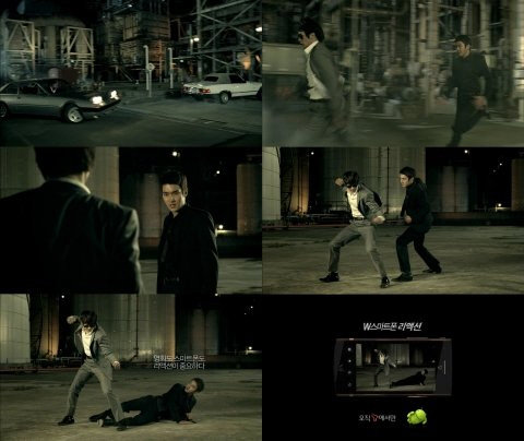 굼뜬 리액션을 취하고 쓰러지는 남자는 슈퍼주니어의 멤버 ‘엄친아’ 최시원이다. 최시원이 리액션폰의 광고모델으로 발탁됐다는 소식은 들었지만 이렇게 코믹한 역할을 맡을 줄은 몰랐다. 더욱이 선글라스를 쓴 상대는 가수 비를 빼닮았다. 리액션폰의 전작인 아우라폰의 광고모델이 바로 비였다.