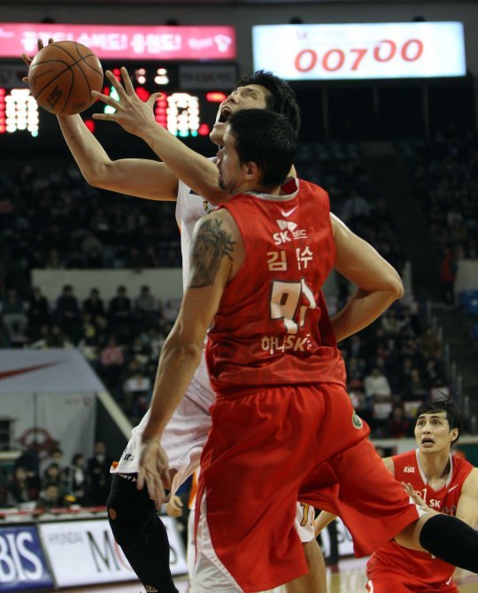 22일 오후 서울 잠실학생체육관에서 열린 2010-11시즌 현대 모비스 프로농구 서울 SK와 인천 전자랜드의 경기에서 전자랜드 서장훈이 SK 김민수의 마크를 피해 골밑 슛을 시도하고 있다.