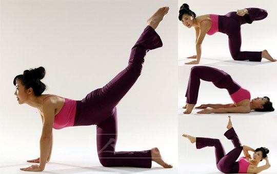 1. 엎드려서 양팔은 어깨넓이로 벌리고 무릎은 골반넓이로 벌린다. 숨을 들이마시며 왼다리를 높게 올린다. 이때 엉덩이에 힘을 준다. 20초 정지, 좌우 교대 3회 반복.