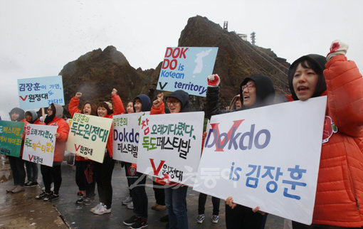 1일 오후 경북 울릉군 울릉읍 독도리에서 열린 '김장훈 독도 콘서트'에 앞서 반크회원, 일반인 등 원정대가 노래를 부르고 있다.