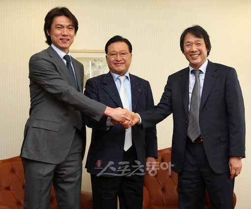 성인 대표팀과 올림픽 대표팀 중복 차출에 따른 갈등을 사전에 방지하기 위해 조광래 국가 대표팀 감독과 홍명보 올림픽 대표팀 감독이 2일 오전 서울 신문로 축구회관에서 만났다. 양 감독과 조중연 대한축구협회회장이 취재진을 향해 포즈를 취하고 있다.