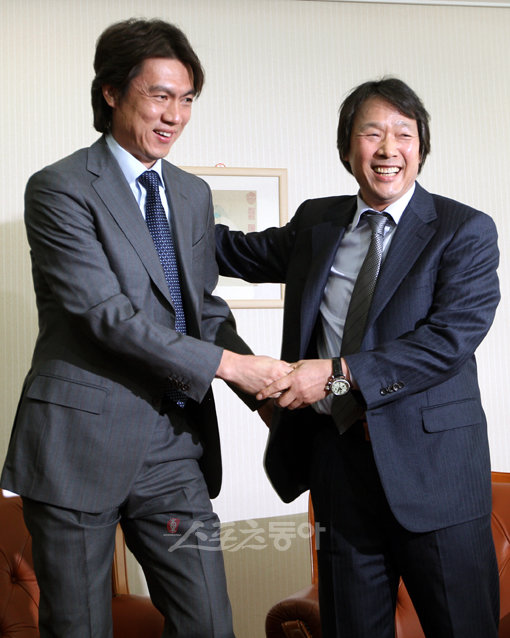 성인 대표팀과 올림픽 대표팀 중복 차출에 따른 갈등을 사전에 방지하기 위해 조광래 국가 대표팀 감독과 홍명보 올림픽 대표팀 감독이 2일 오전 서울 신문로 축구회관에서 만났다. 양감독이 반갑게 웃으며 악수를 나누고 있다.