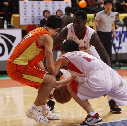 2일 저녁 인천삼산월드체육관에서 열린 2010-2011 인천전자랜드와 서울SK의 경기에서 전자랜드 정병국이 SK 신상호와 레더가 루즈볼을 다투고 있다.