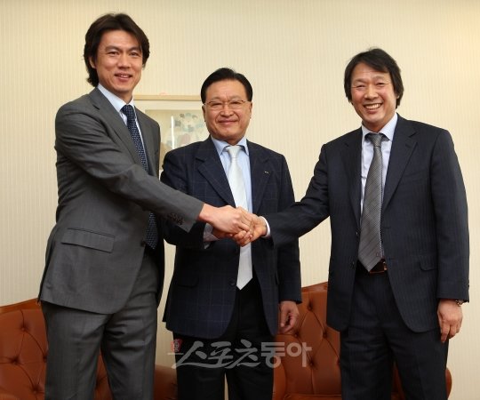 2일 종로구 신문로 축구회관에서 조중연 대한축구협회장과 이회택 기술위원장, 조영증 기술교육국장이 참석한 가운데 A대표팀 조광래 감독과 올림픽대표팀 홍명보 감독이 최근 논란을 빚은 대표 선수 차출 문제를 협의했다.