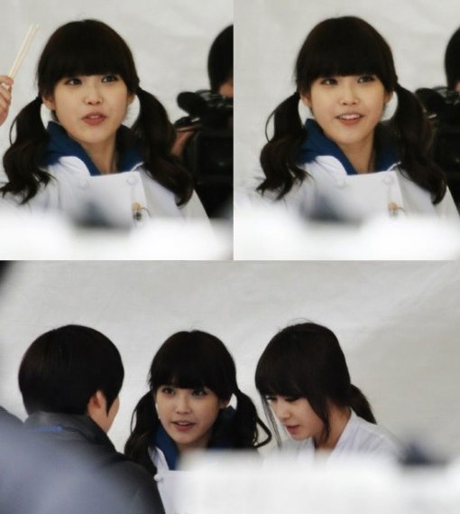 사진속 아이유와 지연은 주방장 복장을 입고 사람들에게 음식을 나눠주는 듯한 모습을 하고 있었다. 특히 아이유는 양갈래 머리를 해 귀여움을 더했고 ‘티아라’의 지연은 청순한 매력을 풍기며 촬영에 임했다.