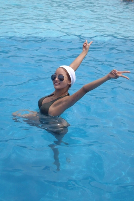 야외 수영장을 배경으로 한 사진에서 소리는 카키색 수영복에 선글라스를 착용하고 브이 포즈를 취하고 있다. 까무잡잡한 탄력있는 피부와 글래머 몸매를 드러낸 소리는 섹시한 매력을 한껏 과시했다.