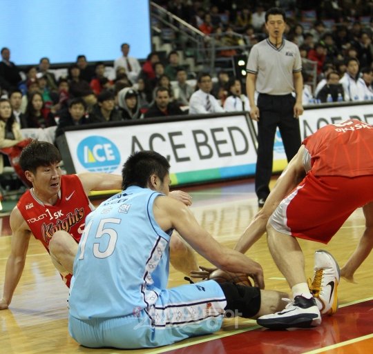 8일 오후 서울 잠실학생체육관에서 열린 2010-11시즌 프로농구 서울 SK와 울산 모비스의 경기 에서 모비스 이승현이 SK 황성인, 백인선과 볼을 다투고 있다.