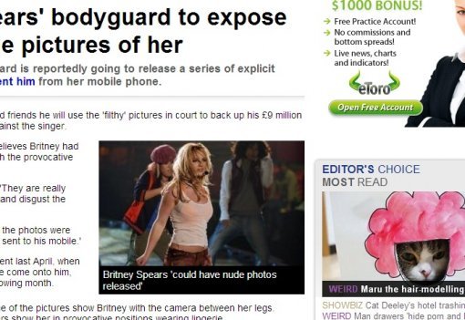 7일(현지시간) 영국 인터넷 신문 ‘메트로’는 "브리트니의 전 경호원인 페르난도 플로레스가 브리트니의 야한 사진을 공개하겠다고 나섰다"고 보도했다.