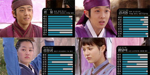 특히 천둥은 모든 항목에서 매우 뛰어난 점수를 기록했지만 경제 항목에서는 0점이다. 극중 천둥이 거지 캐릭터임을 표현한 것.