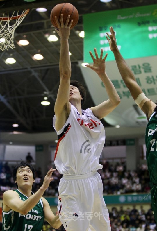 13일 원주 치악체육관에서 열린 2010-11 시즌 현대 모비스 프로농구 원주동부와 부산KT 경기에서 동부 송영진이 상대 수비수를 피해 레이업슛을 하고 있다.