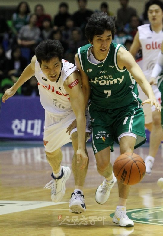 13일 원주 치악체육관에서 열린 2010-11 시즌 현대 모비스 프로농구 원주동부와 부산KT 경기에서 KT 조동현과 동부 류광식이 볼을 다투고 있다.