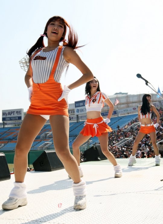 13일 오후 부산 사직구장에서 열린 프로야구 롯데 자이언츠와 SK 와이번스의 시범경기에서 롯데 치어리더들이 열띤 응원전을 펼치고 있다.