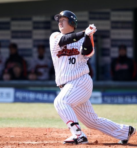 17일 오후 부산 사직구장에서 열린 프로야구 롯데 자이언츠와 넥센 히어로즈의 시범경기에서 3회말 2사 1, 3루 상황에 이대호가 2타점 적시타를 때려내고 있다.