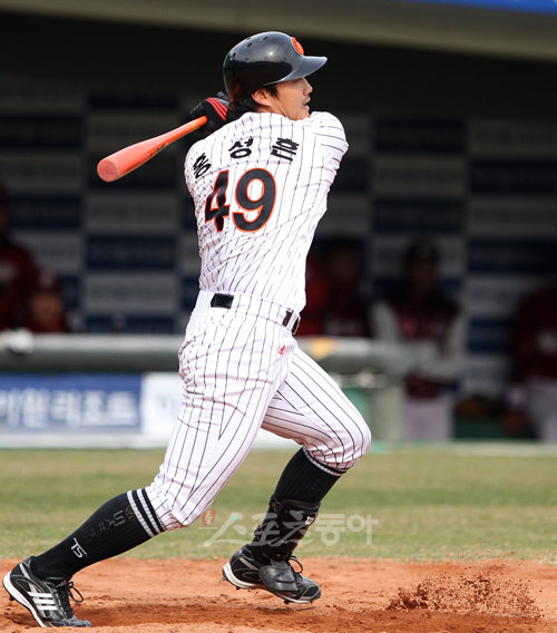 18일 오후 부산 사직구장에서 열린 프로야구 롯데 자이언츠와 넥센히어로즈의 시범경기에서 8회말 1사 1루 상황에 홍성흔이 병살타를 때려내고 있다.