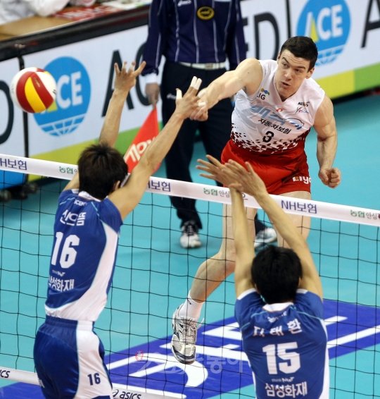 페피치 “뚫었다” 18일 구미 박정희체육관에서 열린 2010∼2011 NH농협 V리그 남자부 준플레이오프 2차전에서 LIG손해보험의 페피치가 삼성화재의 블로킹 사이로 강스파이크를 때리고 있다.