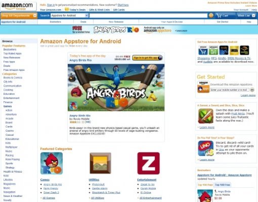 아마존의 첫 번째 킬러 콘텐츠는 ‘앵그리버드 리오(Angry Bird Rio)’라는 게임이다. 이 게임은 다운로드 수 1억 돌파를 앞두고 있는 앵그리버드 시리즈의 최신작으로, 헐리우드 20세기 폭스에서 제작중인 애니메이션 ‘리오(Rio)’를 원작으로 삼았다. 아마존 앱스토어는 안드로이드 마켓을 제치고 앵그리버드 리오를 독점 출시하며, 앱스토어 출시 첫날에 맞춰 하루만 무료로 배포 중이다<OR 배포했다 한국시간으로 23일 정오쯤 마감되니 기사 릴리즈에 맞춰서..>(정가는 0.99달러). 최고의 인기 게임 독점 출시에 ‘오늘만 무료’ 혜택이라니, 후발주자로서 이목을 끌기 위한 최적의 선택인 셈이다(참고로 한국 시각으로 22일 오후 5시 경, 아마존이 앱스토어 카테고리를 홈페이지에서 갑자기 삭제했다. 실수로 예정 시각보다 빠르게 공개했던 것인지, 아니면 플랫폼에 문제가 생겨 점검에 들어간 것인지는 확인할 수가 없었다).