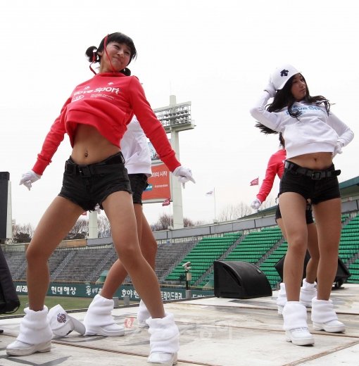 24일 오후 서울 잠실야구장에서 열린 LG 트윈스와 롯데 자이언츠의 시범경기에서 LG 치어리더들이 응원전을 펼치고 있다.