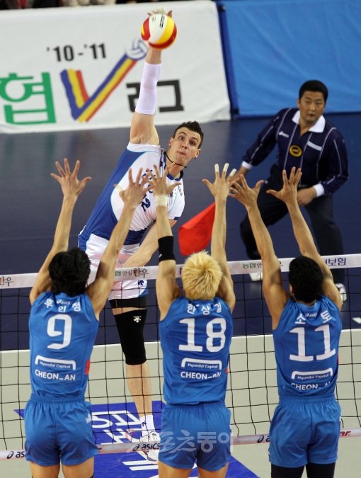 24일 오후 천안 유관순체육관에서 열린 프로배구 10-11V리그 현대캐피탈과 삼성화재의 플레이오프 2차전 경기에서 삼성화재 가빈이 수비벽을 두고 공격하고 있다.