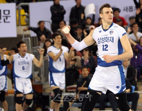 24일 오후 천안 유관순체육관에서 열린 프로배구 10-11V리그 현대캐피탈과 삼성화재의 플레이오프 2차전 경기에서 3세트를 따낸 삼성화재 가빈이 기뻐하고 있다.