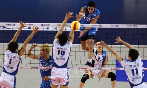 24일 오후 천안 유관순체육관에서 열린 프로배구 10-11V리그 현대캐피탈과 삼성화재의 플레이오프 2차전 경기에서 현대캐피탈 소토가 수비벽을 두고 공격하고 있다.