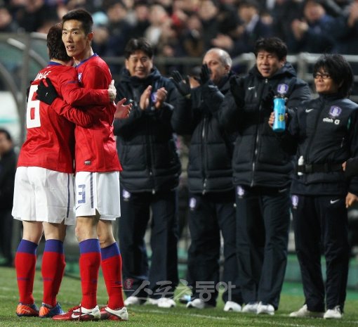 25일 오후 8시 서울월드컵경기장에서 열린 한국축구대표팀과 온두라스의 2011년 첫 번째 A매치 경기에서 김정우가 두번째 골을 터트리고 이용래와 포옹하고 있다.
